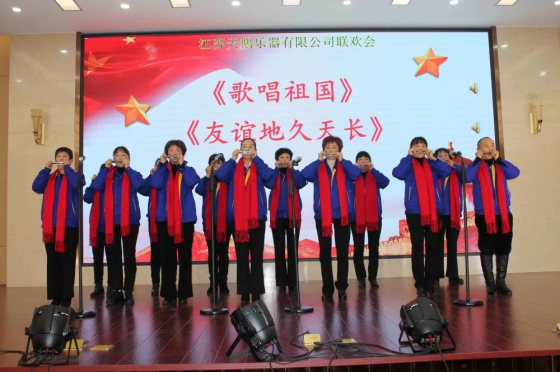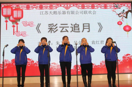 表彰會(huì)結(jié)束后,接下來(lái)的聯(lián)歡會(huì)也熱鬧非凡。聯(lián)歡會(huì)由萬(wàn)詩(shī)蔓、劉亮主持,口琴吹奏、舞蹈、詩(shī)朗誦、歌唱,表演形式多樣,今年更是請(qǐng)到了天鵝摯愛(ài)口琴班的同學(xué)們來(lái)到聯(lián)歡會(huì)現(xiàn)場(chǎng),獻(xiàn)上了《愛(ài)爾蘭畫(huà)眉》、《小城故事》、《歡聚一堂》等精彩的口琴表演。作為專(zhuān)業(yè)生產(chǎn)口琴的企業(yè),天鵝公司涌現(xiàn)了一大批口琴演奏人才,他們共同組成了天鵝口琴樂(lè)團(tuán),帶來(lái)了一首又一首旋律優(yōu)美、吹奏難度較高的口琴演奏。