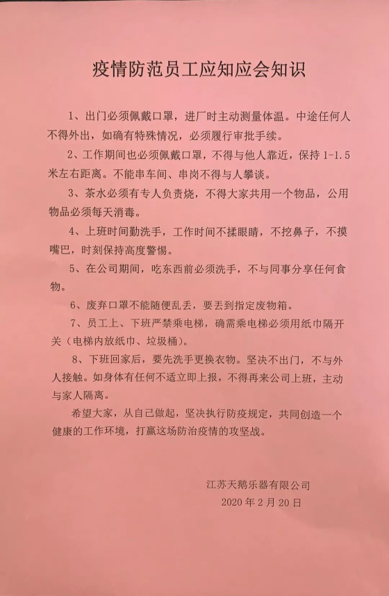 當前,疫情防控工作形勢依然嚴峻復雜,疫情防控仍是當前重要的工作,貫徹外防輸入、內防擴散的方針,堅定信心、同舟共濟、科學防治、精準施策。天鵝樂器選擇了2020.02.20這個特殊的日子開工,是出于對生命的尊重和員工的愛護,錢可以慢慢賺,但生命只有一次,員工的健康平安比什么都重要!