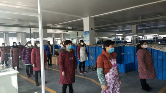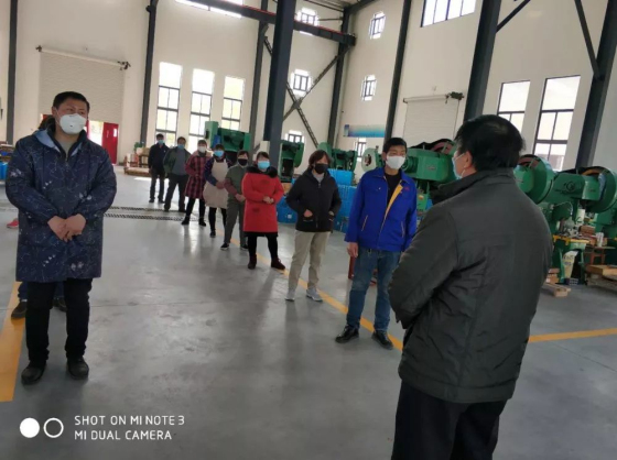 2月20日上午,在鎮防疫工作駐廠員的指導監督下,疫情防控領導小組成員根據成員的分工,分批、有序地對每位進廠員工進行消毒、體溫檢測、派發口罩等物資,董事長及鎮防疫工作駐廠員對部門負責人以及車間主任宣傳防疫知識,并要求傳達給每一位員工,做到戴口罩、勤洗手、多通風。