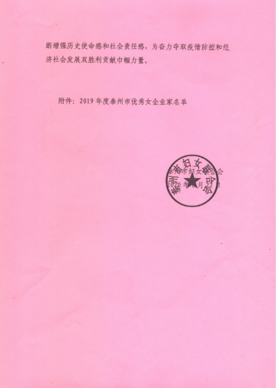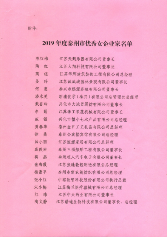 在泰州市巾幗三大聯盟成立大會上,天鵝樂器董事長陳紅梅被泰州市婦女聯合會聘為泰州市巾幗手工產業聯盟理事長,并被泰州市婦女聯合會和泰州市女企業家聯合會聯名授予泰州市2019年度“優秀女企業家”榮譽稱號。