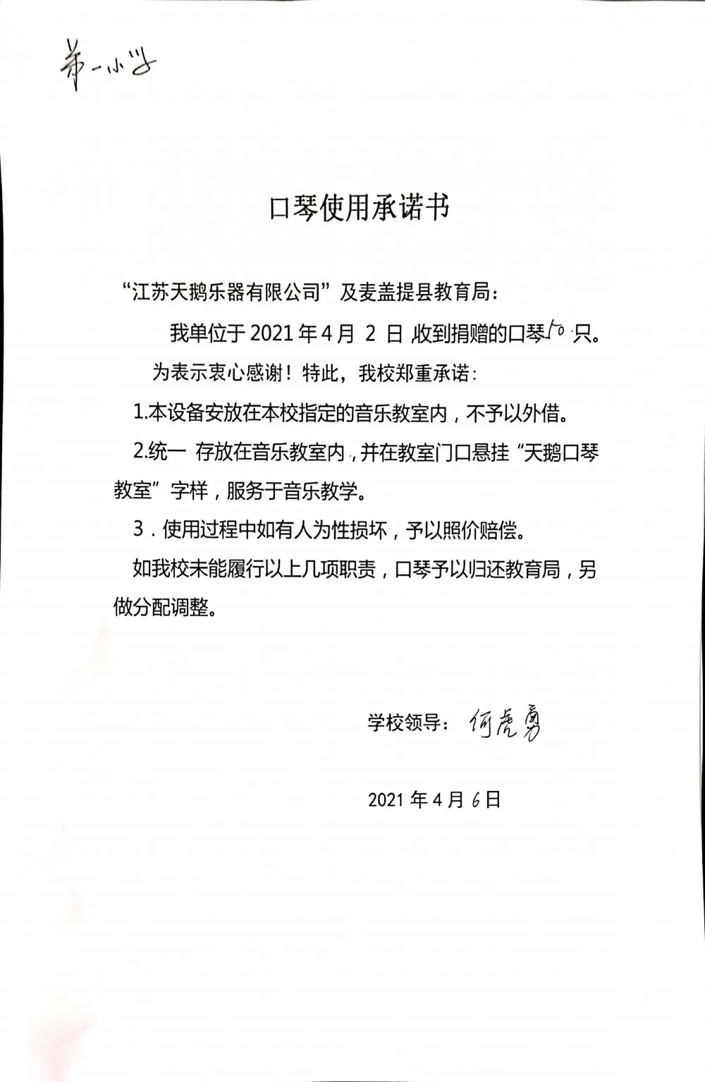 希望能通過今天的愛心口琴捐贈儀式與貴公司架起音樂之橋、友誼之橋,能夠讓我們的孩子通過口琴這一樂器將麥蓋提的聲音及維吾爾文化傳出新疆傳向全國!同時,我們更熱忱歡迎江蘇天鵝樂器有限公司的各位領(lǐng)導(dǎo)及社會各界有識之士來麥蓋提觀光旅游、捐資助教、參與開發(fā)建設(shè),讓我們一起攜手辦好教育,為黨育人、為國育才。
