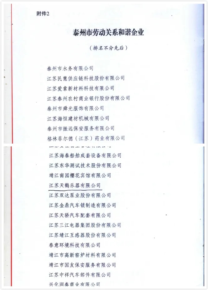 天鵝樂(lè)器被泰州市人民政府評(píng)為2019-2020年度“泰州市勞動(dòng)關(guān)系和諧企業(yè)”。