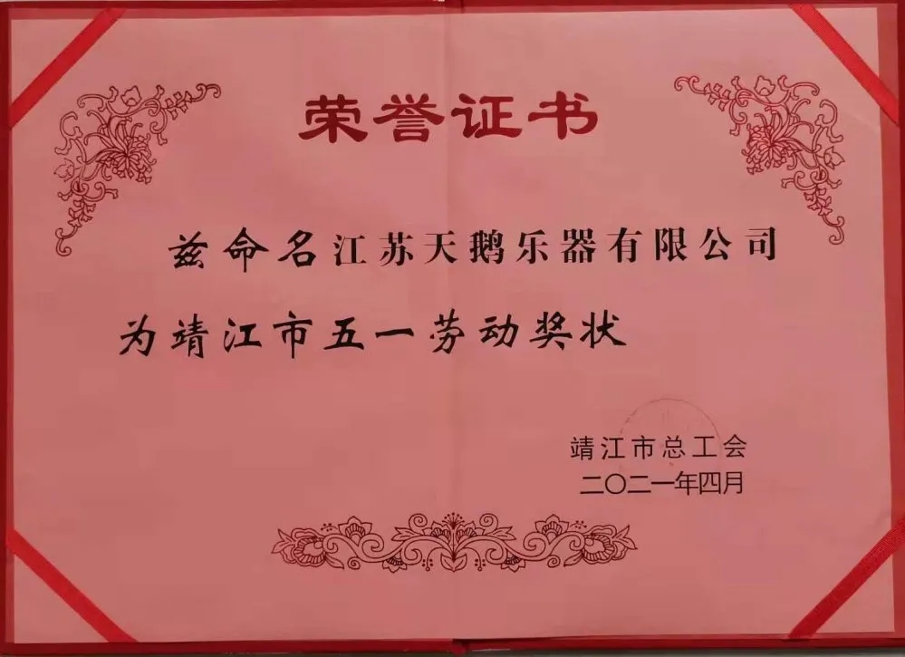 天鵝樂(lè)器在2020年的工作中,以關(guān)愛(ài)廣大員工工作、生活為己任,開(kāi)展員工思想道德教育,開(kāi)展操作技能比賽,處處體現(xiàn)了企業(yè)的正能量,增加了員工的凝聚力。日前,靖江市總工會(huì)授予天鵝樂(lè)器“五一勞動(dòng)獎(jiǎng)狀”。